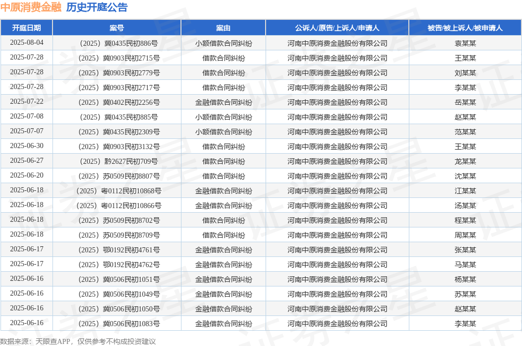 本站消息,根据天眼查APP显示,近日公布了一则河南中原消费金融股份有限公司作为原告/上诉人的开庭公告,详细内容如下: